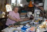 Auf den Aquarellen, Ölgemälden und Pastellkreidebildern sind überwiegend Landschaften, Menschen und Tiere festgehalten. Fast fühlt man sich hier wie in einer Ausstellung, doch durch die vielen gestapelten Bilderrahmen mangelt es etwas an der für gemütliches Flanieren nötigen Beinfreiheit. Hier lebt seit 20 Jahren die Malerin und Grafikerin Liselotte Finke-Poser. Bereits im Jahr 1953 zog sie mit ihrem Mann von Leipzig nach Radebeul.